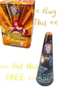 A combination fountain emitting showers of sparks which consist of silver strobe, red, blue & silver chrysanthemum effects and silver crackling stars.